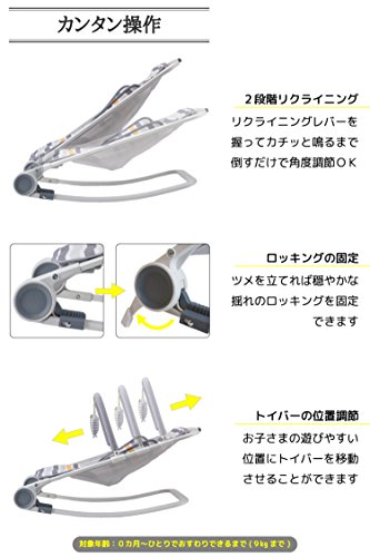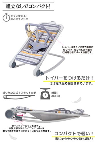 使わないときはコンパクトに折りたたみ収納!軽量で家じゅう持ち運びがラクラク!穏やかな揺れのロッキングはツメを立てるだけで固定可能です。リクライニングレバーを握ってカンタンに角度調節できます。トイバーはスライド式で動かせて、お子さまの遊びやすい位置に調節可能。