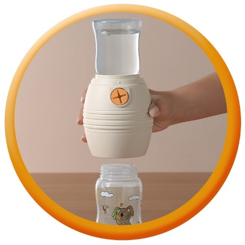 ●専用のボトルにお湯を注ぎ、粉ミルクを入れた哺乳瓶の上にセット。丁度良いぬるま湯が哺乳瓶へ注がれます。