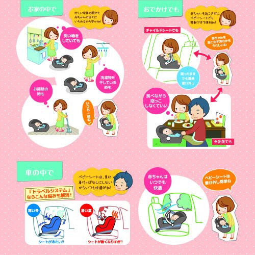 【新生児のドライブをより安全に、快適に】 ●「スマートキャリー+イージーベース」は、病院で出産後、退院の際からすぐにご使用いただけるベビーシートです。 ●車に簡単設置のベースを取り付けておくと、ベビーシートの脱着がスムーズにできます。 ●トラベルシステムアダプターを標準装備。ベビーカーに取り付けてトラベルシステムとしてもご使用いただけます。