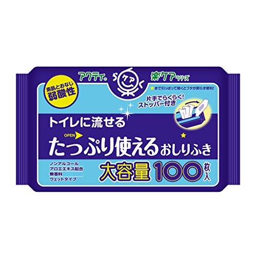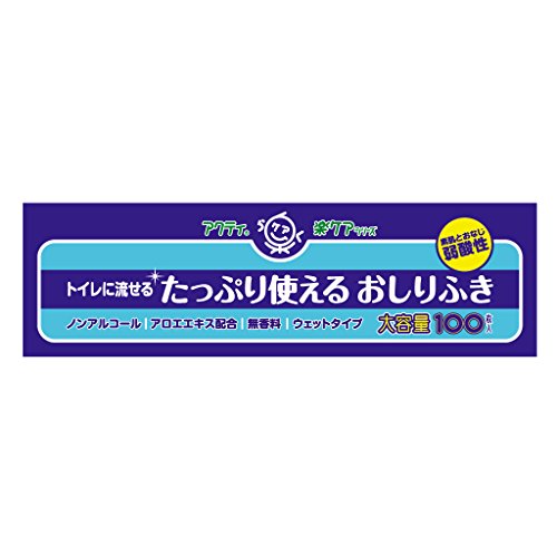 ●【商品説明】●「アクティ トイレに流せるたっぷり使えるおしりふき 100枚入」は、使用後にトイレに流せて、たっぷり使える大容量100枚入りの介護用おしりふきです。●ノンアルコール。●アロエエキス配合。●無香料。●ウェットタイプ。●【使用方法】●手に巻いておしりを拭きます。●使用後トイレに流せます。●【ご注意】●使用後は中身の乾燥を防ぐためフタでぴったり密封してください。●【素材】●アロエエキス配合、ノンアルコール、弱酸性●【原産国】●日本●まとめ買いの場合、システムの仕様で個数分の送料が加算される場合がありますが、送料は1配送先につき1個分の金額となります。●システムの仕様で配達日を指定出来る場合がありますが、配達日の指定は出来ませんのでご了承ください。尚、時間指定は出来ます。●ご注文確定後のキャンセルならびに、お届けしました商品のお客様都合による「返品 交換」は行っておりません。