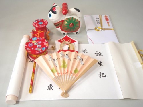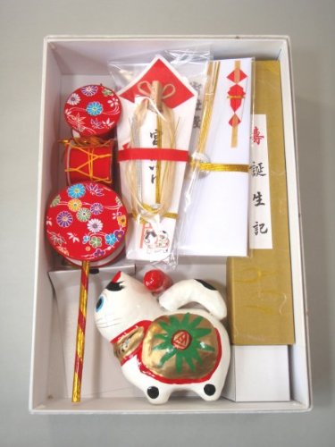 お宮参りの必需品、赤ちゃんの誕生と、健康な成長を願うお宮参りに欠かせない物となっています。男児は出産後31日、女児は32日にお宮参りをすると良いといわれています。(地方により違いがあります。) 犬張子、でんでん太鼓、奉納扇子、誕生記、熨斗袋、麻ひもがセットになっています。使い方は、麻ひも、犬張子、でんでん太鼓、奉納扇子、熨斗袋を通して赤ちゃんを被った初着の後の結び目につるします。また、犬張子は子供部屋に飾るとお守りになるといいます。 *熨斗(のし)かけご希望の方は、カート内で熨斗希望をご記入下さい。箱入り*写真は女の子用です、男の子用は扇子と熨斗が青くなります