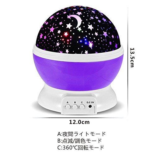 - ★【三つのボタン】: Aモードは夜間ライトモード、Bモードは光色変換モード、Cモードは360°回転モードです。図案も三種類に変換できます。