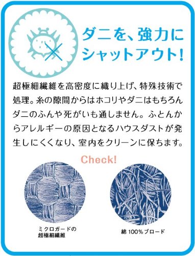 超極細繊維を高密度に織り上げ、特殊技術で処理。糸の隙間からはホコリやダニはもちろん、ダニのふんや死骸も通しません!ふとんからアレルギーの原因となるハウスダストが発生しにくくなり、室内をクリーンに保ちます。