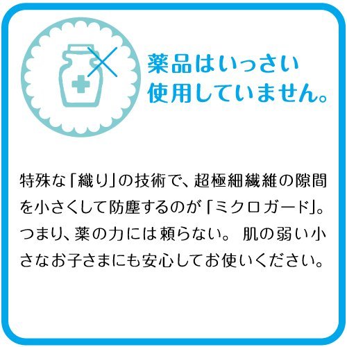 特殊な「織り」の技術で、超極細繊維の隙間を小さくして防塵するのが「ミクロガード」。つまり、薬の力には頼っていません。肌の弱い小さなお子様も安心してお使いいただけます。