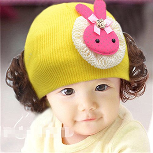 ニット帽 赤ちゃん 3カ月 ~ 4歳 子供ハット かつら ウィッグ 付き 新生児 お洒落 伸縮性がある ヘアバンド ヘアアクセサリー 出産祝い プレゼント 写真小道具,水玉 ウサギ イエロー
