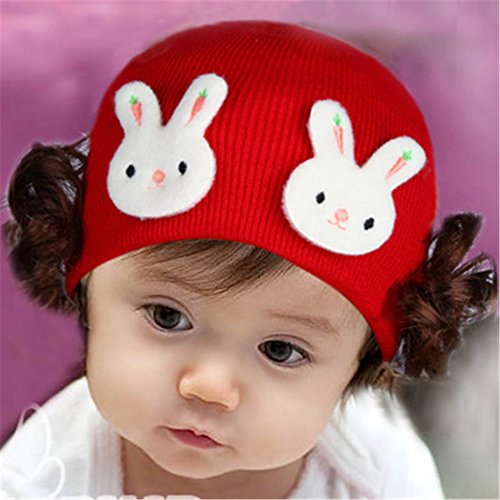 ニット帽 赤ちゃん 3カ月 ~ 4歳 子供ハット かつら ウィッグ 付き 新生児 お洒落 伸縮性がある ヘアバンド ヘアアクセサリー 出産祝い プレゼント 写真小道具, ダブルウサギ レッド