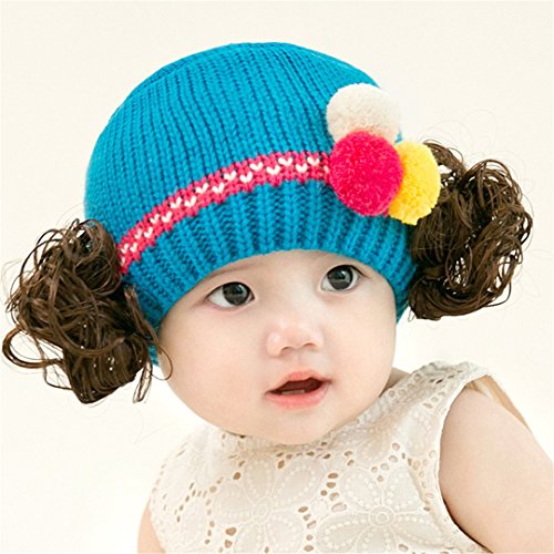 ニット帽 赤ちゃん 5カ月 ~ 3歳 子供ハット かつら ウィッグ 付き ポンポン 伸縮性がある ヘアバンド ヘアアクセサリー 防寒防風対策 出産祝い プレゼント (Blue)