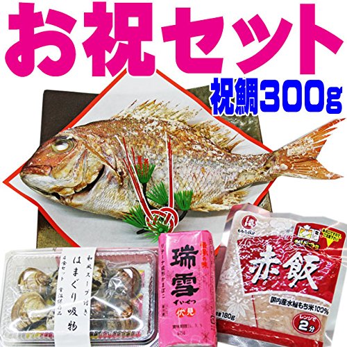お祝いに欠かせない鯛の塩焼きに簡単に調理できるアイテムをセットにしました。 お食い初めや長寿の祝いに、誕生祝いなど、お祝いにいかがでしょうか? 内容 ・祝い鯛 約300g(25~26cm) ・はまぐり吸い物(4人前) ・かまぼこ1個180g ・赤飯(4パック) 真鯛の重さは水揚げ後の重さの表記となっています。 焼き上がりの重さとは異なります。