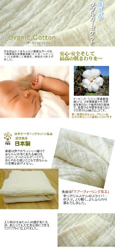 無農薬の有機栽培で生産された綿 を使用して無着色、無蛍光と自然の ままの安心で安全なガーゼケットです。 日本オーガニック協会認定品 【日本製】 「エアーフィーリング加工」 ダブルガーゼの中にポリエステルの スライバーを入れ、羽毛のような軽さ とふんわり感を出しました。 サイズは100×120cmの大判サイズ で大きくなってもご使用いただけます。 ※弊社のオリジナル品となります。 当店のみの限定販売品となります。