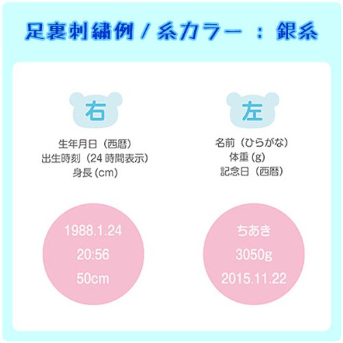 - 刺繍糸カラーは銀糸にて刺繍します。 足裏(右足・左足)の刺繍内容はご注文後にメールにてご連絡ください。 例:「1988.1.24/20:56/50cm」 例:「ちあき/3050g/2015.11.22」