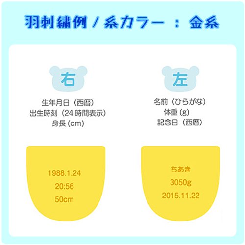 - 刺繍糸カラーは金糸にて刺繍します。 羽(右・左)の刺繍内容はご注文後にメールにてご連絡ください。 例:「1988.1.24/20:56/50cm」 例:「ちあき/3050g/2015.11.22」