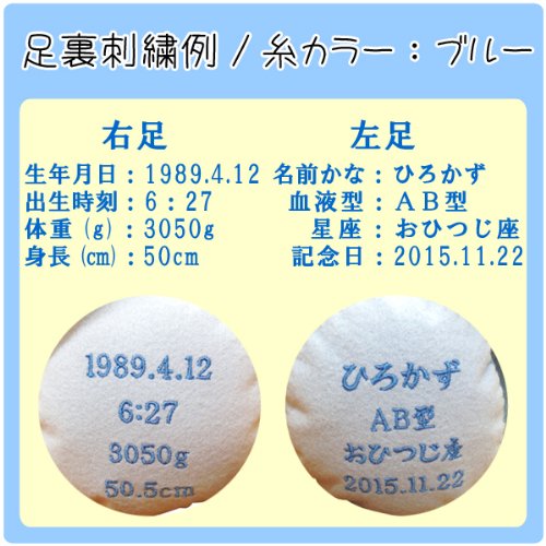 - 刺繍糸カラーはブルーにて刺繍します。 足裏(右足・左足)の刺繍内容はご注文後にメールにてご連絡ください。 例:「1982.9.20/19:10/2950g/50cm」 例:「あいこ/A型/おとめ座/2015.11.22」