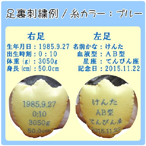 - 刺繍糸カラーはブルーにて刺繍します。 足裏(右足・左足)の刺繍内容はご注文後にメールにてご連絡ください。 例:「1982.9.20/19:10/2950g/50cm」 例:「あいこ/A型/おとめ座/2015.11.22」