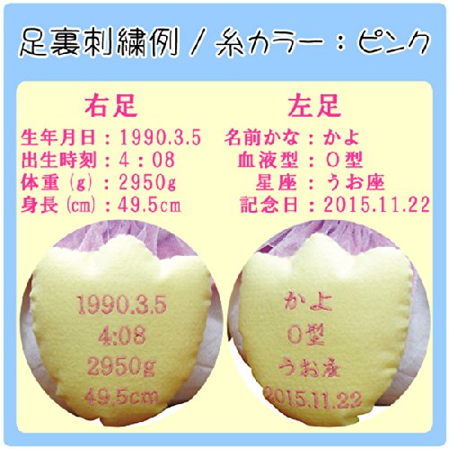 - 刺繍糸カラーはピンクにて刺繍します。 足裏(右足・左足)の刺繍内容はご注文後にメールにてご連絡ください。 例:「1982.9.20/19:10/2950g/50cm」 例:「あいこ/A型/おとめ座/2015.11.22」