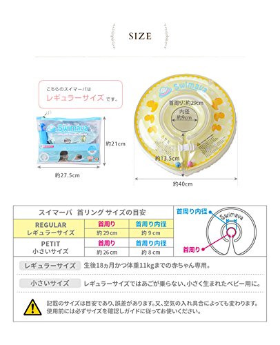 - [本体サイズ] 空気充填時:リングの内側(首周り部分) 約25~30cm前後、内径8.5~9.0cm、うきわの外径直径40cm前後(いずれも空気量により変わります)