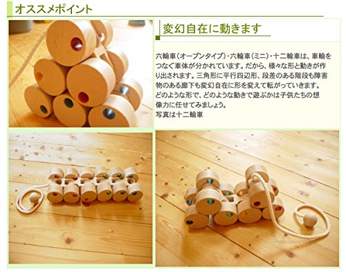 - 十二輪車(ロングタイプ)は、六輪車(ミニ)の2倍の長さです。3段の三角形になったり、2段の平行四辺形になったり、自在に形を変えられる面白さがあります。2004年日本グッド・トイ認定。