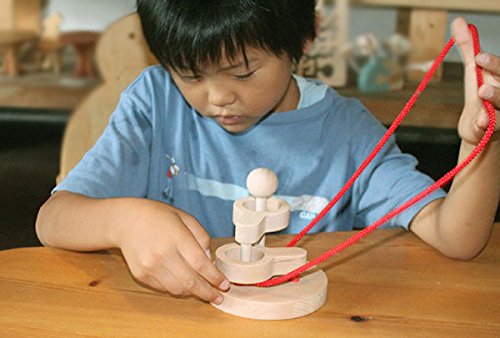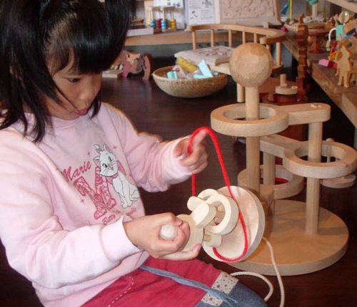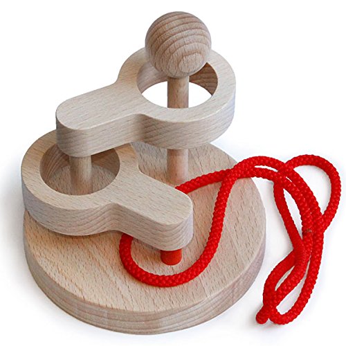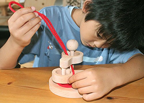- 木のリングを組み合わせて出来た立体の木製知恵の輪です。一番下に巻かれた赤い紐を動かして抜き取ります。