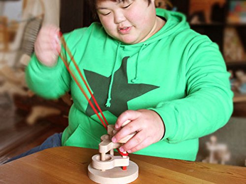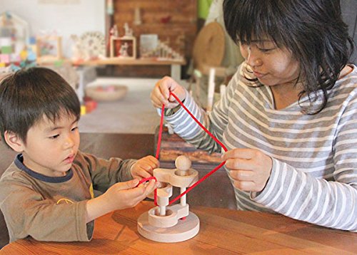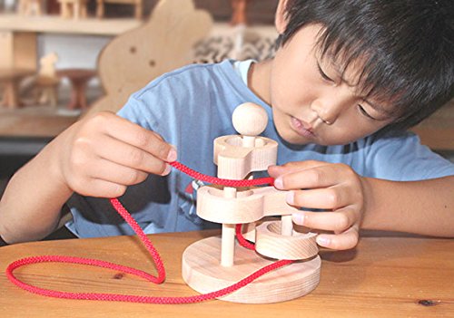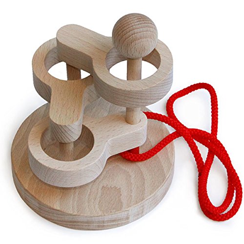 - 木のリングを組み合わせて出来た立体の木製知恵の輪です。一番下に巻かれた赤い紐を動かして抜き取ります。