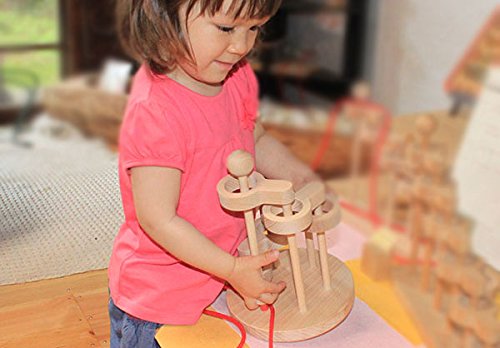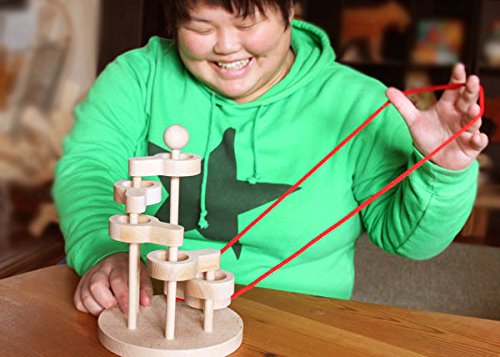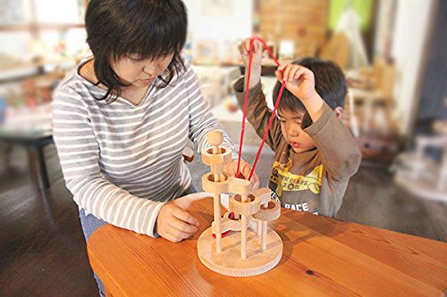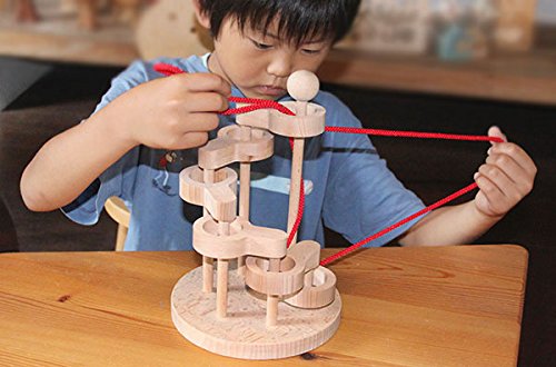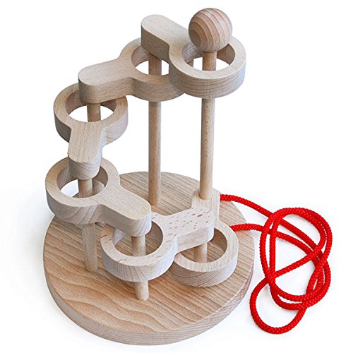 - 木のリングを組み合わせて出来た立体の木製知恵の輪です。一番下に巻かれた赤い紐を動かして抜き取ります。