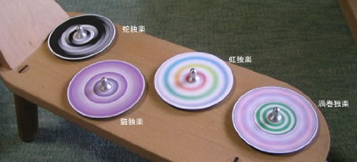 - 例えば猫独楽は赤と青がとけあって紫のグラディーションがうかびあがり、蛇独楽は白黒のデザインですが回転すると、虹のような色が見えます。そして回転中の独楽に顔を近づけてまばたきをくり返すと混ざり合った色が分解されて見えたり、絵が立体的に飛び出して見える独楽もあります。