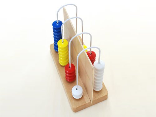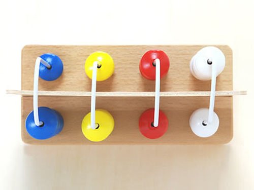 青、黄色、赤、白のおはじきをループにそって動かします。 小さな子供はおはじきを反対側に落とすシンプル手先の動かし方を覚えることができます。お母さんがおはじきを反対側に落とし消えたり現れたりすりるおはじきにも興味津々です。すこし大きくなると色や数の認識も出来るようになり遊び方もひろがります。