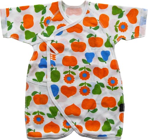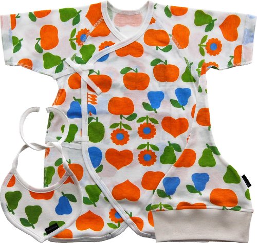 明るいカラーの大き目フルーツ柄が特長の、新生児用ベビーウエア3点セットです。