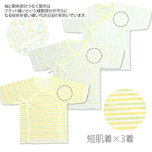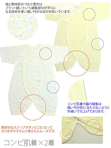 - 出産準備品としてはもちろん、お祝い品としてもご活用いただける日本製の新生児肌着セットです。デリケートなお肌のベビーに安心してご利用いただける様に素材を厳選し、短肌着3枚、コンビ肌着2枚のとってもお得で便利なセットをご用意いたしました。