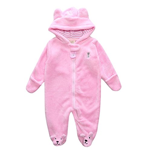 杜屋トヤ 子供服 ベビー 長袖ロンパース ボディースーツ スリーパー ルームウェア 無地 ジッパー フード付き 足つき 前開き クマの耳 足つき かわいい 防寒 秋 冬 カジュアル 遊び お出かけ プレゼント 女の子 男の子 赤ちゃん 3M/6M/9M (6 -- 6M / 58cm, ピンク)