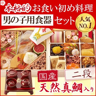 お食い初め豪華二段セット 日本橋正直屋 和食伝統料理の老舗 これ一つでお食い初めの儀式が出来ます (男の子用 器付き)