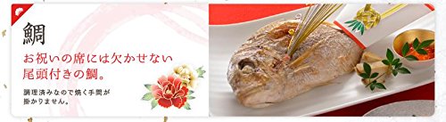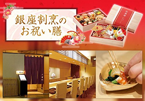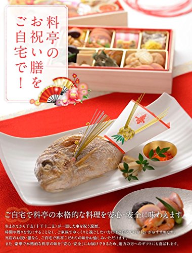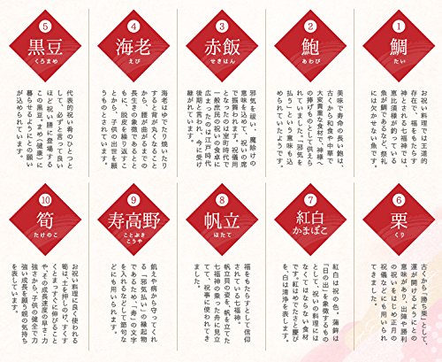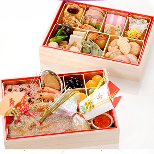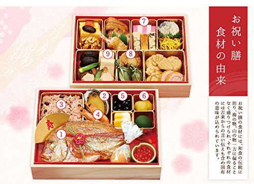 内容:鯛塩焼、蛤時雨煮、赤飯、あさりすまし汁、有頭海老煮、亀竹の子旨煮、数の子、いくら醤油漬け、鰊昆布巻、黒豆、サーモンきぬた巻、いいだこ酢漬け、紅蒲鉾、白蒲鉾、寿高野豆腐煮、里芋煮、花こんにゃく煮、椎茸丸煮、大根(なます)、梅人参(なます)、栗甘露煮、市松柿ロール
