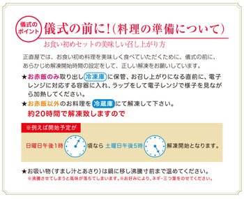 - 解凍説明書・一括表示・祝箸・尾紙・ヒレ飾り・歯固めの石・お食い初め解説書各種