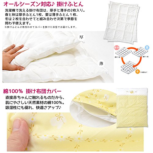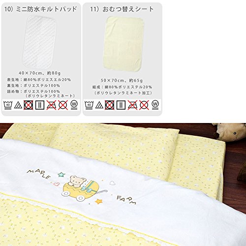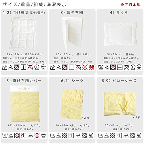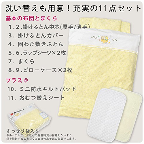 - 【セット内容】①掛けふとん(厚手)②掛けふとん(薄手)③敷きふとん ④掛けカバーリング ⑤ラップシーツ ⑥洗い替え用ラップシーツ ⑦まくら ⑧枕カバー ⑨洗い替え用枕カバー ⑩防水キルトパッド ⑪おむつ換えシート