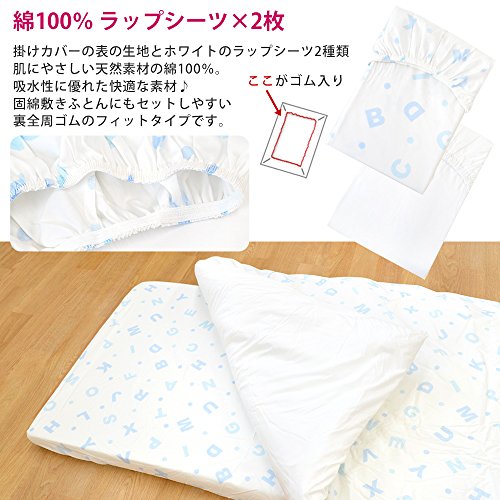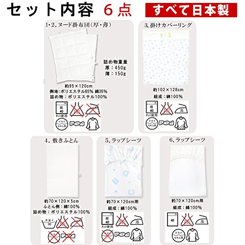 - 本体サイズ[ヌード掛けふとん(厚・薄)]約 95×120cm[掛けカバーリング]約102×128cm[合繊敷きふとん(固わた)]約70×120×厚さ5cm[ラップシーツ]約70×120cm(1枚あたり)