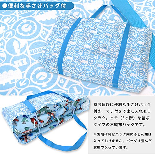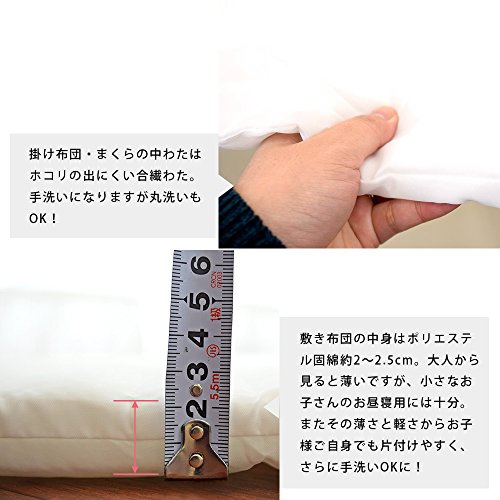 - [本体サイズ]掛カバー:80×110cm 掛布団:79×109cm(キルティング製品許容範囲+5%、-3%) 敷カバー:69×122cm 敷布団:67×120cm 枕カバー:38×26cm 枕中芯:35×23cm バッグ:70×42cm