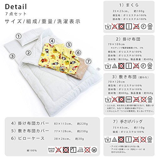 - 【セット内容】 1)まくら 2)掛けふとんヌード 3)敷きふとんヌード 4)ピローケース 5)掛けふとんカバー 6)敷きふとんカバー 7)手さげバッグ