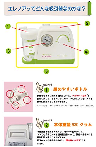 セット内容 ●本体 ●専用ACアダプタ ●吸引ホース ●吸引チップ(大)(小)各1個 ●吸引ボトル ●吸引チップ用コネクター ●キャリングバッグ ●取扱説明書(保証書付) ※吸引圧力は、安全のため-10kPakから-40kPaの範囲内でご使用することをお勧めします。 ※ご使用する圧力が高すぎますと、鼻出血や怪我の原因となりますのでご注意下さい。