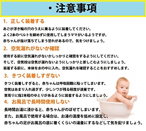 お子様の一人遊びは出来ません。◆使用中は絶対にお子様から目を離さないでください。◆上下2つのベルト(クリップ)を留めてください。◆あごが首浮き輪の穴から下にさがる状態で使用しないでください。◆空気漏れを確認してからご使用ください。
