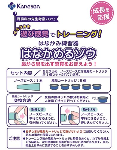 ●【商品説明】●耳鼻科の先生と共同開発しました。●お子様が上手に鼻から息を出せれば、風船がとびだす仕掛けになっており、遊び感覚ではなかみのトレーニングができます。●風船を繰り返し膨らませることで、鼻から息を出す感覚を覚えることができます。●風船には3頭のゾウのイラスト入り。●お子様に「ゾウさん3頭出せるかな?」と興味を持たせて、トレーニングすることができます。●ノーズピースは柔らかい素材なので、お子様の鼻にも安心して使用できます。●この製品は鼻をかむものではありません。●まとめ買いの場合、システムの仕様で個数分の送料が加算される場合がありますが、送料は1配送先につき1個分の金額となります。●システムの仕様で配達日を指定出来る場合がありますが、配達日の指定は出来ませんのでご了承ください。尚、時間指定は出来ます。●ご注文確定後のキャンセルならびに、お届けしました商品のお客様都合による「返品 交換」は行っておりません。