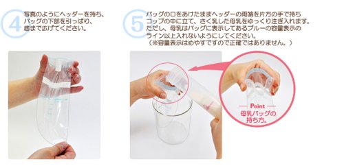 (5)バッグの口をあけたままヘッダーの両端を片手で持ちコップの中に立て、搾乳した母乳をゆっくり注ぐ。ただし、母乳バッグに表示してあるブルーの容量表示のライン以上は入れないようにする。