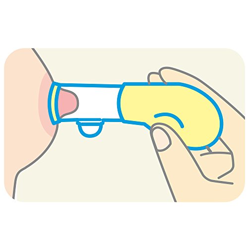 ゴム球を軽く押し、吸引ノズルの先を乳頭にあてて、ゆっくりと緩めてください。必要に応じて、これを3~6回繰り帰し、引き出した乳頭を赤ちゃんにくわえさせ、授乳してください。
