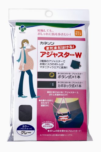 「カネソン まだまだはける!アジャスターW グレー」は、妊娠前のジーンズやパンツがまだまだ履けるようになるアジャスターです。少しお腹が出てきて、今までのボトムが入らなくなってきた頃から、妊娠後期の大きなお腹まで調節OK。