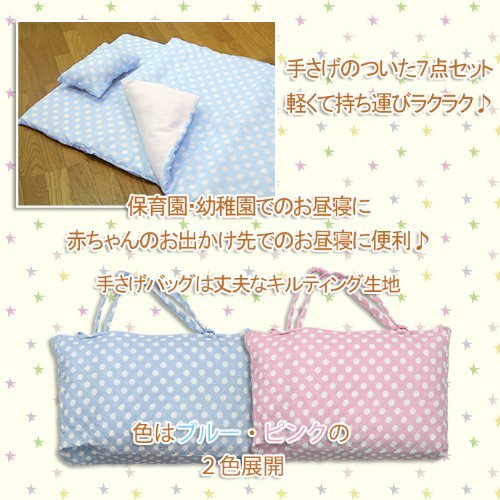 可愛らしいドット柄で、持ち運び便利なバック付き布団セット