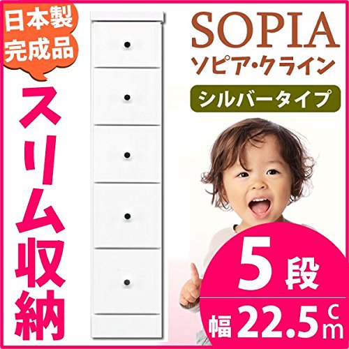すき間収納 チェスト 幅22.5cm 5段 (本体:ホワイト、取っ手:シルバータイプ&色おまかせ) 【日本製 完成品】 大川家具