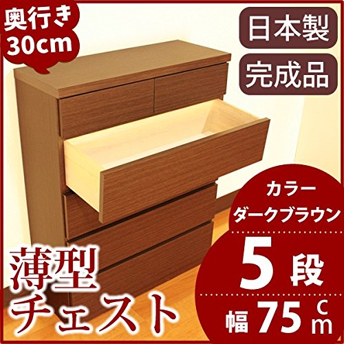 薄型チェスト 奥行30cm 幅75cm 5段 ダークブラウン木目調 【日本製 完成品】 大川家具