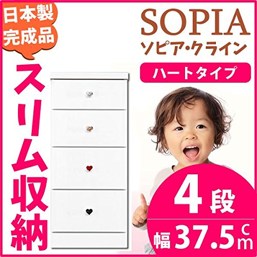 すき間収納 チェスト 幅37.5cm 4段 (本体:ホワイト、取っ手:ハートタイプ&色おまかせ) 【日本製 完成品】 大川家具