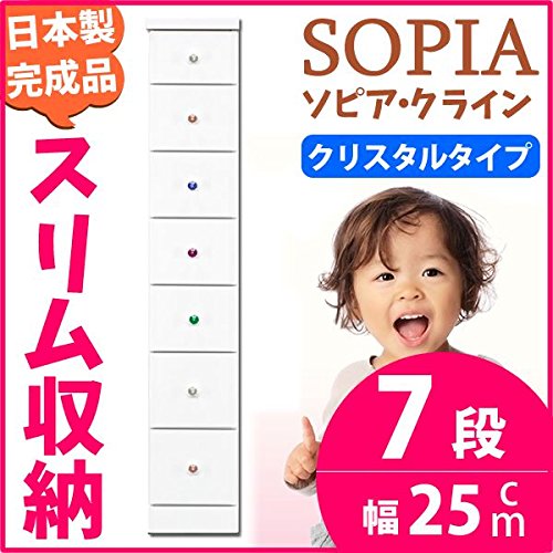 すき間収納 チェスト 幅25cm 7段 (本体:ホワイト、取っ手:クリスタルタイプ&色おまかせ) 【日本製 完成品】 大川家具
