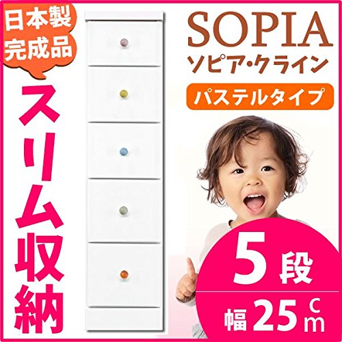 すき間収納 チェスト 幅25cm 5段 (本体:ホワイト、取っ手:パステルタイプ&色おまかせ) 【日本製 完成品】 大川家具