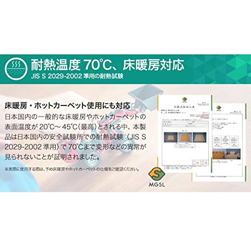 日本国内の一般的な床暖房やホットカーペットの表面温度が20℃~45℃(最高)とされる中、本製品は日本国内の安全試験所での耐熱試験(JIS S 2029-2002準用)で70℃まで変形などの異常が見られないことが証明されました。