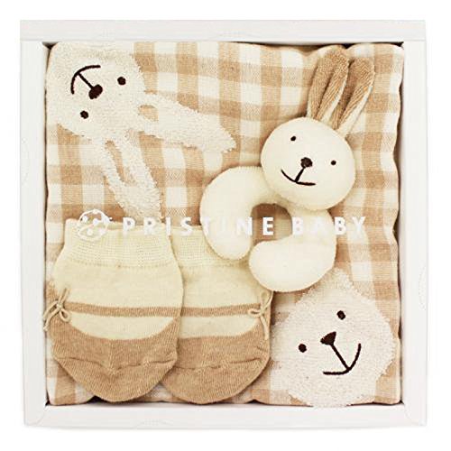 ◆べビーもニコニコ顔に!◆オーガニックコットンのやさしい肌触りの素材からつくられたベビーアイテムが人気の「PRISTINE(プリスティン)」。こちらはPRISTINEの中でも特に人気の「うさぎガラガラ」「ガーゼタオル」「くつソックス」の3点をギフトBOXに入れたセットです。 普段使いやお出かけシーンはもちろん、出産お祝いなどベビーギフトにぴったり。靴下にはさりげなくリボンが付いており、特に女の子におすすめです。 PRISTINE(プリスティン)のベビーアイテムは、紡績、編み、織り、縫製などのすべてが日本国内で行われ、安心・安全なものづくりのもとに生まれています。 ■うさぎガラガラ 赤ちゃんは音の鳴るものが大好き。やさしいオーガニックコットンで作られたガラガラは、赤ちゃんのファーストトイとしておすすめです。鈴はさびないようにプラスチック製で、軽やかな音が鳴るように作られています。 ■ガーゼタオル 片面はガーゼ、もう片面はパイル地のガーゼハンカチタオル。可愛らしいうさぎとクマがポイントです。 ■くつソックス やさしい肌触りの靴下は、まるでくつを履いたようなデザイン。リボン付きのストラップシューズ風で赤ちゃんの足元のアクセントに。