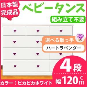 取っ手が選べるローチェスト/タンス 120cm幅 4段(本体:ピカピカホワイト 取っ手:ハートラベンダー×全12個) 【日本製】【完成品】